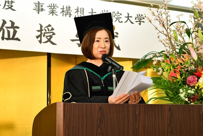 「本日ここに106名の事業構想修士が誕生します。学校法人先端教育機構の理事・評議員、教職員一同を代表し、心からの御祝いを申し上げます。今から2年前、社会全体に不安と停滞が続く中にあっても、希望と活路を見出そうと模索するように、10期生の皆さんは本学の門をたたかれました。政府は新しい資本主義の実現を目指すべく「人への投資」「人的資本経営」を柱とし、強力に推進しています。これにより、リカレント教育、学び直しを重要とする社会の潮流は、より色濃く広がりをみせています。企業内にイノベーションを起こす源泉として、次の本業の柱をつくる機会として、事業承継を推進する装置として、これまでの社会人経験、仕事のスキルや知見を活かしながら、事業構想を研究し、研究と実務を往還する生き方を実践する事業構想修士の存在は、まさに現代社会の最先端であり、世の中を牽引しているようです。この一連を身につけた事業構想修士の皆さんは、構想を考える力で、この先もさらに歩みを進めていくことでしょう。社会に新たな価値を創出する人材として、それぞれの可能性をさらに広げていかれますことを祈念し、心よりお祝いを申し上げます。」