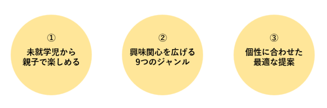 一人一人の子ども達に最適なオンライン体験を以下3つの特徴で提供することにより、日本の未来を担う子ども達のさらなる興味関心の広がりと共に「こどもまんなか社会」の実現※3に貢献していきます。