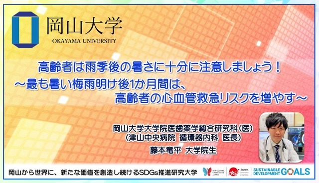梅雨後の極端な暑さは心血管疾患に影響を及ぼします!特に高齢者を健康面で支えるため、梅雨明け1か月間はできる限り外出を控え、水分摂取をこまめに行い、涼しい室内で過ごせるよう環境整備を重点的に行うことが、心血管救急の予防につながります。救急搬送データを提供いただいた岡山市救急課の方々に改めて感謝申し上げます。