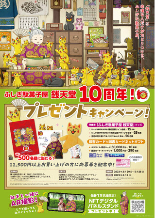 キャンペーン参加書店で、購入商品問わず合計1,500円(税込)以上お買い上げの方に、銭天堂オリジナルグッズや、廣嶋玲子さんとjyajyaさんのイラスト入り色紙などが当たるキャンペーン応募券を配布。計500名様に豪華賞品が当たります! また、シリーズ購入者特典や、オリジナル拡材などで店頭を盛り上げます。