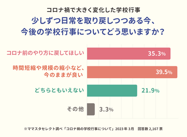 今回ママスタセレクトに寄せられた回答数は2,167票。「時間短縮や規模の縮小など、今のままが良い」と考えているのは約40%、「コロナ前のやり方に戻してほしい」と選択したママは約35%でした。そして、約22%は「どちらでもない」と答え、のこりの約3%は「その他」の結果となりました。