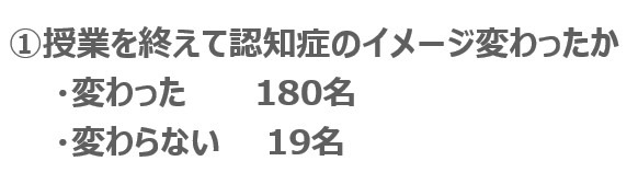 生徒の皆さんからは、「介護の仕事はまだマイナスなイメージがあるため、そこを改善していく必要がある。」や「大事な人が認知症になったら、最初はショックで受け入れられないが、これまでの恩をどうやったら返せるだろうかと考える。」など、これからの高齢化社会に向けた前向きな姿勢が見られました。