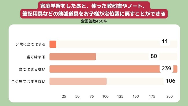 しかし勉強した後の片づけについて聞くと、およそ8割の子どもたちが「家庭学習をしたあと、使った教科書やノート、筆記用具などの勉強道具を定位置に戻すことができない」と答えました。