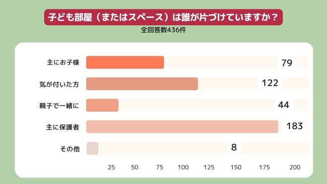子ども部屋の片づけを誰が行っているか尋ねたところ、最も多い42%が主に保護者であると答えました。次いで28%が気がついた方、10%が親子で一緒に。主に子どもだけでお片づけができているのは18%という結果でした。