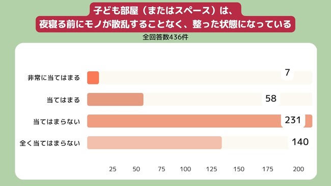 また、「子ども部屋は夜寝る前に整った状態になっている」と答えたのは全体の15%に留まり、85%の家庭では子ども部屋が散らかった状態で一日を終えていることが分かります。