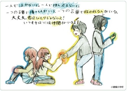 目的・想い:「日々大切にしたい想い」と「いじめをおこさないために」をテーマに6年生51人がそれぞれのイラストと言葉を考えました。楽しい時間は一緒に笑顔になって、つらい時は一緒に支え合ってくれる友達や仲間がいつもそばにいることを、児童全体に伝えたい。その想いから、低学年用・高学年用の2種類の下敷きを作りました。スローガンは「友だちは宝物」「そばには仲間がいるよ」です。