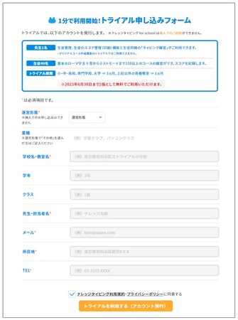 必要事項を入力したら、その場で、先生1名、生徒40人分のアカウントが即時発行されます。お気軽にお試しください。