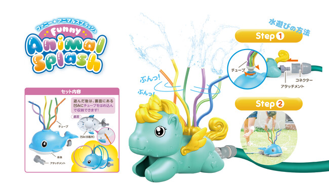 特徴:水道のホースにセットするだけで、楽しく水遊びができる♪水を噴射しながらチューブがぶんっ!ぶんっ!あらゆる方向に激しく水しぶきを撒き散らす♪最大飛距離が約5mで大人数で水遊びが可能。暑い夏もスプラッシュ・アニマルと水浴びをして楽しもう!