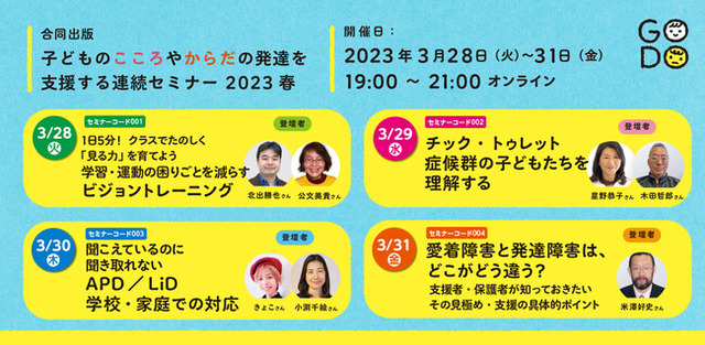 「視覚機能」を高めるビジョントレーニング、チック・トゥレット症、耳がキャッチした音を脳が上手に認識できない「APD/LiD」、愛着障害について、最前線で活躍する講師陣がオンラインでお届けするセミナーを開催致します。家庭や特別支援教育・療育・保育の現場で役立つ知識や支援のポイントが詰まっております。またセミナー当日は講師に質問ができますので、是非ご参加ください。
