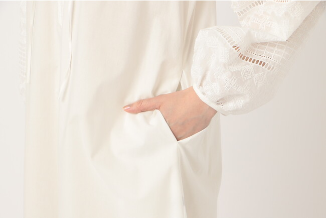 ・レースは、薄地の生地に幾何学の刺繍を施したエンブロイダリーレースです。ふんわりとした柔らかな風合いに仕上げました。繊細なカットワークと透け感がポイントです。