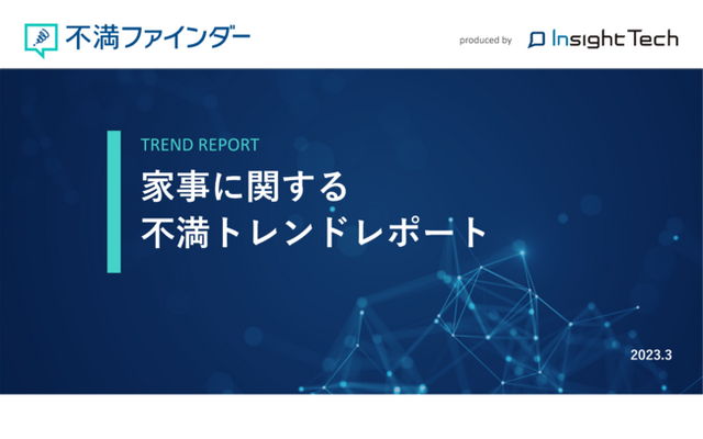 株式会社 Insight Tech(東京都新宿区、代表:伊藤友博、以下 Insight Tech)は、同社が運営する『不満買取センター』に寄せられた「家事」に関する不満を『不満ファインダー』を用いて解析・考察したレポートを公開しました。