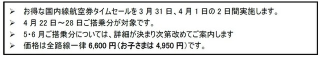 このたび再びタイムセールを実施できるシステム環境が整ったことから、お客さまの「飛行機に乗って日本中を旅したい」というご期待にお応えすべく、改めて国内線航空券タイムセールを実施します。5・6月搭乗分については、詳細が決まり次第改めてご案内します。