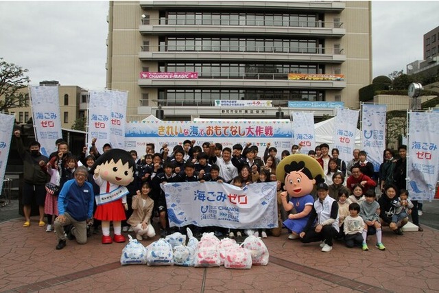 しずおか海洋ごみゼロ対策プロジェクト実行委員会は、しずおか海ごみゼロPR大使の「ちびまる子ちゃん」と日本財団 海と日本プロジェクト特別推進パートナーの「サザエさん」と記念写真が撮れる特典付きのごみ拾いイベントを、3月21日(火・祝)に実施し、新たな世代のごみ拾い体験者の取り込みや、町や海のごみ問題を自分ごと化としてとらえていただくことを目的として、「きれいな海でおもてなし大作戦」を開催いたしました。このイベントは、日本財団が推進する海洋ごみ対策プロジェクト「海と日本プロジェクト・CHANGE FOR THE BLUE」の一環で開催するものです。