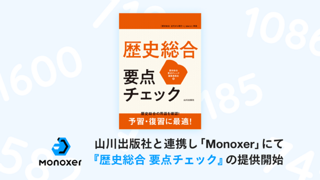 モノグサ株式会社(東京都千代田区 代表取締役:竹内 孝太朗、畔柳 圭佑)は記憶定着のための学習プラットフォーム「Monoxer(モノグサ)」が、株式会社山川出版社(東京都千代田区 代表取締役:野澤 武史、以下「山川出版社」)よりライセンスを受け、Monoxer上で『歴史総合 要点チェック』を導入教室に向けて2023年度にリリースすることをお知らせいたします。