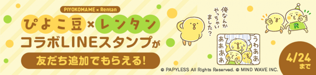 『ぴよこ豆』は株式会社マインドウェイブ所属の人気クリエイターTomo.N(トモエヌ)氏が描く、ころころもちもちで癒される大人気キャラクターです。本コラボレーションではぴよこ豆たちに加え、Renta!公式キャラクター『レンタン』も登場!