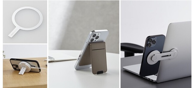 iPhoneにマグネットで取り付けられる、カードポケット付き背面フリーアングルスタンドです(※5)。