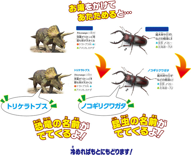 「学研の図鑑LIVE」とコラボレーションした、「こたえがでてくる!おふろでスタディ」に恐竜・昆虫の2種が新しく発売となります。おふろの壁に水でくっつくポスターシートには、恐竜や昆虫の情報がたくさん書かれています。お湯をかけてあたためると、恐竜や昆虫の名前や特徴などがでてくるので、毎日の繰り返しで徐々に知識を深めることができます。