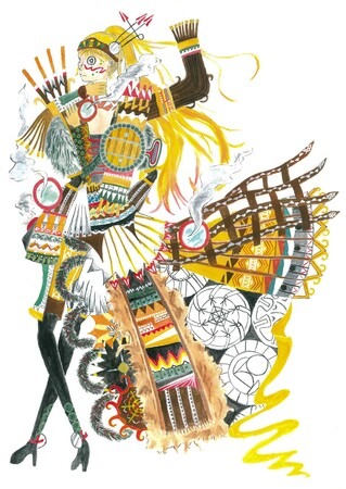 「初めにこのような賞をいただき光栄です。結果を聞いた時とても驚きました。 作品についてですが、デザイン画を見た時に「かっこいい」「衝撃的」という言葉が出てくるような、この人物が今にも動き出しそうな、そんなデザインにしました。特に袖やスカートの細かい部分は色を沢山使うけれど、全体の印象から大きく外れないように描きました。 この賞で今の自分に満足せずデザインの引き出しを増やして、もっと良い作品が作れるようにこれからも勉強していきたいと思います。」