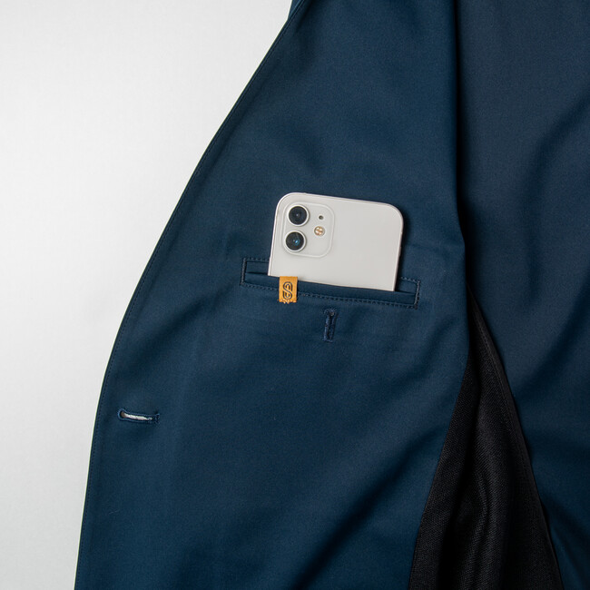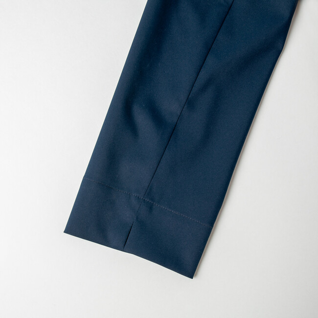 授業参観や面談でも使えて、固い印象になりすぎないノーカラージャケットは、黒板を書く際や肩周りの大きな動作も快適にできるようゆとりのあるサイズにし、背中が見えにくく、お尻もしっかり隠れる丈感にしました。ジャケット内側はポケット2つ、ペン挿しとセンセイカプセルのピスネームを配置。パンツはゴムを両サイドに内蔵することで、腰回りのもたつきが一切なくなり、タックを入れることでよりスタイリッシュに仕上げています。