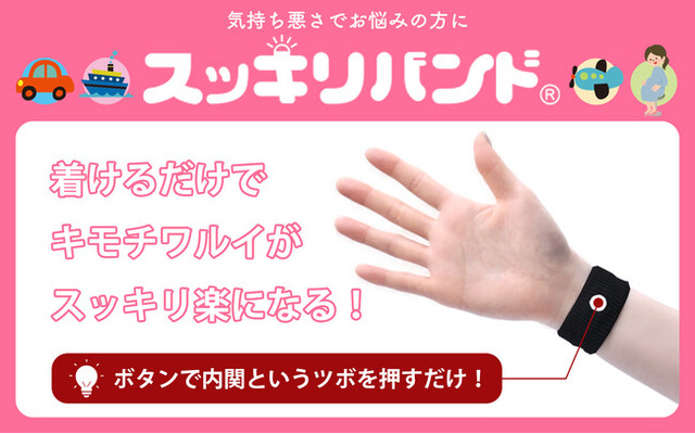 「スッキリバンド(R)」は、乗物酔いや緊張、二日酔い、様々なキモチワルイ不快感を軽減するツボとして効果的な“内関(ないかん)”を押すリストバンド状の一般医療機器です。繰り返し使用でき眠気などの副作用もなく、子どもから高齢者まで幅広い層にご利用いただいています。