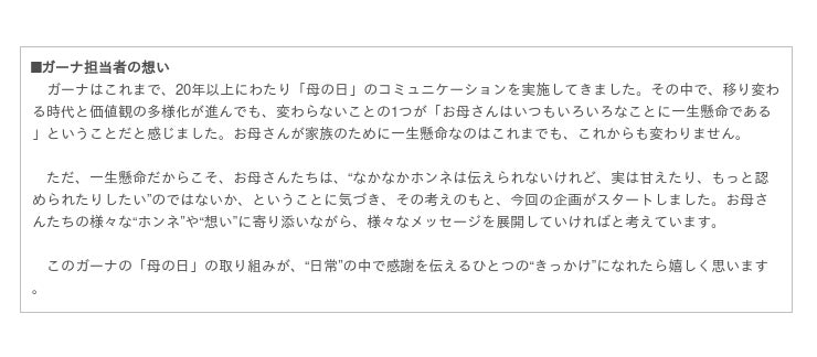 今年のガーナは、「いつもみんなのことを考えて、一生懸命なお母さんたちが少しでも甘えたり、ホンネを伝えられたりするきっかけになれれば」という想いのもと、母の日に向けたキャンペーンを店頭グラフィックやSNSなどを通じて展開いたします。そして、皆さまにとって、日常の中でちょっとした感謝や気持ちを伝えるためのお手伝いができるような存在になれれば、と思っています。