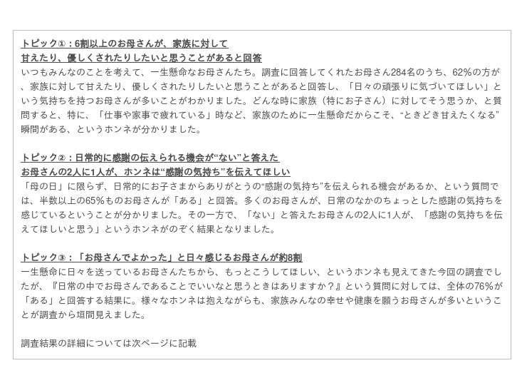 また、様々なホンネは抱えながらも、「笑顔で過ごしていてほしい」、「健康でいてほしい」、「みんなが幸せでいてほしい」など、家族みんなの幸せを願うお母さんが多いということも、調査から垣間見えました。