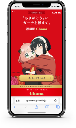 スペシャルメッセージサイト内で「だいすき」「お疲れ様」など、お母さんに伝えたい気持ちを2つ選ぶと、「SPY×FAMILY」キャラクターのボイス付きのメッセージカードを自動で生成し、出来上がったメッセージカードはLINEやメールを通じて送信することが可能です。