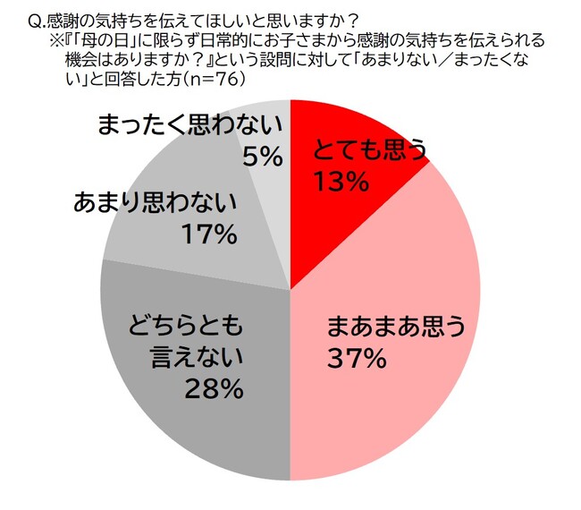 「あまりない」、「まったくない」と回答された方(n=76)に、『感謝の気持ちを伝えてほしいと思いますか?』という調査を実施したところ、2人に1人のお母さんが、ホンネでは、感謝を伝えてほしいと思っている、ということが分かりました。
