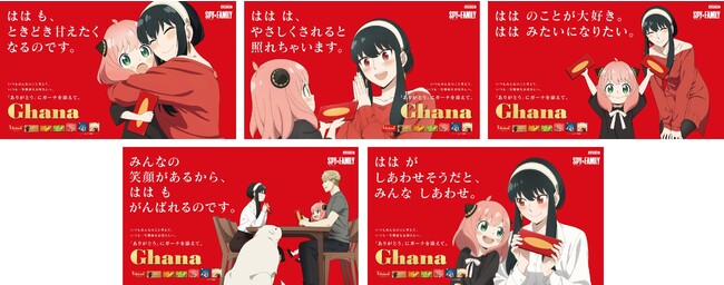 ガーナは、2023年4月4日(火)から母の日に向けて、人気アニメ『SPY×FAMILY』と初となるタイアップを実施いたします。チョコレートをプレゼントしようとしたアーニャにヨルが抱きつく様子が印象的なメインビジュアルをはじめとした描き下ろしのグラフィックビジュアル(全5種)などを、店頭、Webを中心に展開し、母の日を盛り上げます。ガーナは、“一生懸命なお母さんたちが少しでも甘えたり、ホンネを伝えたりできるきっかけになれれば”という想いのもと、様々な施策を展開してまいります。