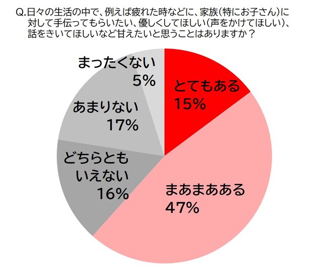 毎日、いつもみんなのことを考えて一生懸命なお母さんたちは、家族に対して「甘えたい」と思っている、というホンネが見える調査結果となりました。