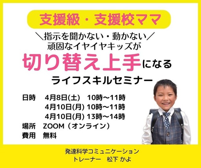 年度はじめはお子さんの不安や緊張が高まりやすく、どうしても家でグズグズしたり癇癪が増えたりすることもあるでしょう。ママが子どもにガミガミ言ってしまうことが増えてしまいます。新年度のスタートに楽しくお子さんの切り替え力を伸ばしたいママはこの無料オンラインセミナーにご参加ください。