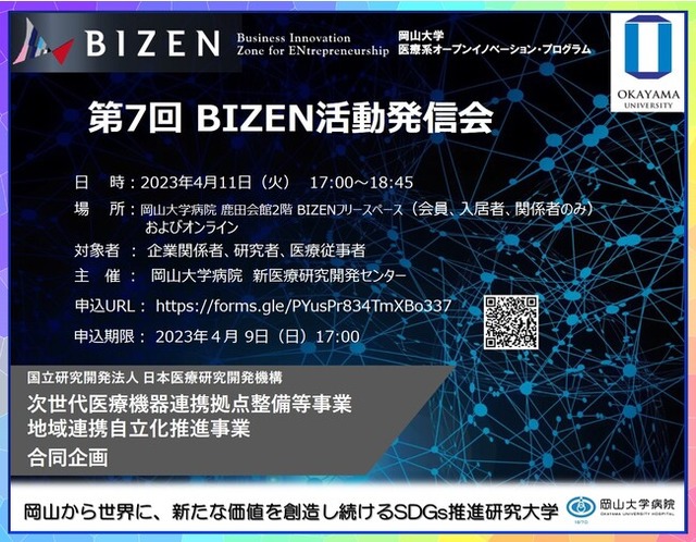 今回、国立研究開発法人日本医療研究開発機構「次世代医療機器連携拠点整備等事業」「地域連携自立化推進事業」合同企画として、2023年4月11日(火)に「第7回BIZEN活動発信会」を開催します。