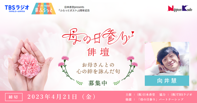 株式会社日本香堂(本社:東京都中央区、代表取締役社長:土屋義幸)は、同社提供のラジオ番組「ふらっとポスト」(TBSラジオ 月~木 「パンサー向井の#ふらっと」内)で、5月14日の「母の日」に向けた “お母さんとの心の絆”を詠んだ俳句作品を公募する 『母の日参り 俳壇』を開催いたします。