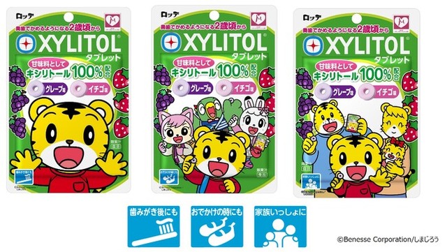 キシリトールを甘味料中100%使用、食べやすい穴あきタイプのタブレットです。お子様に人気のグレープ味とイチゴ味の2種類をアソートしています。お子様が歯みがき後にもお召し上がりいただけます。パッケージデザインには、新たに、しまじろうのお友達や家族が新登場!チャック付きパウチタイプですので、いつでもどこでも持ち歩いて、ぜひお友達やご家族とも一緒にお召し上がりください。