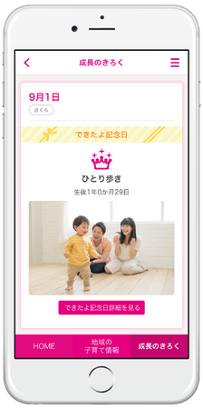 育児日記として使用できる「できたよ記念日」は、厚生労働省の母子健康手帳様式例などを元に作成し、母子健康手帳の「保護者の記録」を含む発達段階や子育てにかかわる記念日を写真やメッセージと共に記録できるだけでなく、子どもの成長・発達の目安としての役割も備えています。