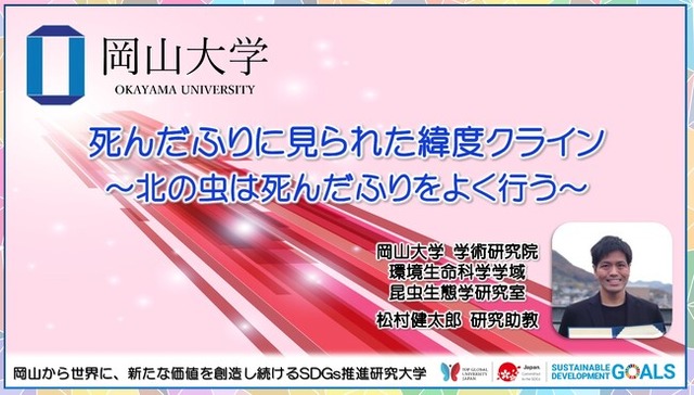 ファーブルとダーウィンが、昆虫の死んだふり行動に興味を持って以来、この不思議な行動は世界の誰も十分なデータで研究していませんでしたが、死んだふりが天敵を回避するのに有効な戦略であることを世界に先駆けて示した岡山大学の研究チームは、昆虫の死んだふり行動は緯度で変化すること(緯度クライン)を発見しました。