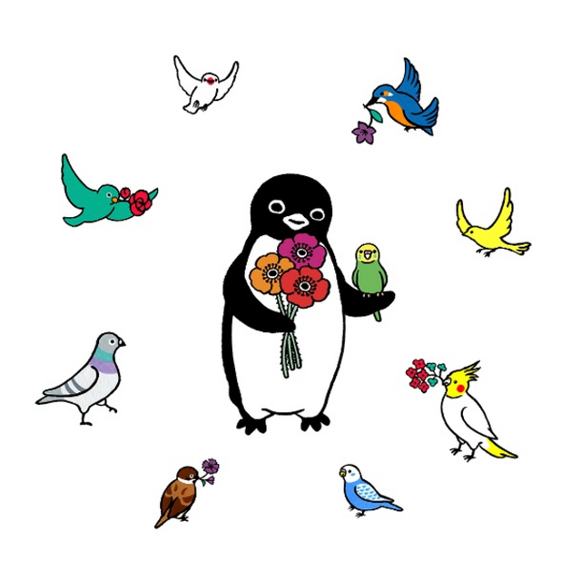 ペンギンが色とりどりの鳥や花に囲まれて、幸福感たっぷりの一枚です。