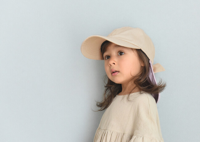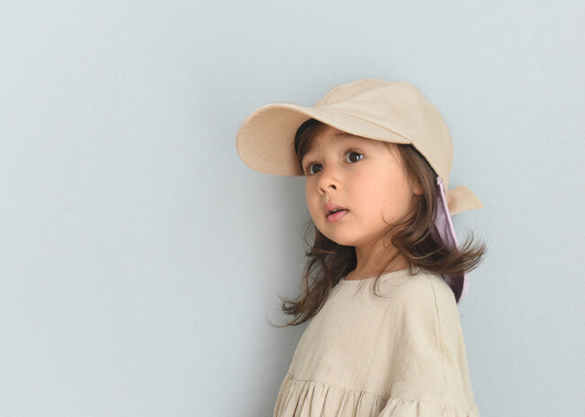 kukka ja puu(クッカヤプー)のキッズ帽子シリーズは、子どもの頭を日差しから守るのと同時に、首元の「日よけタレ」で首筋まで日差しからガード。