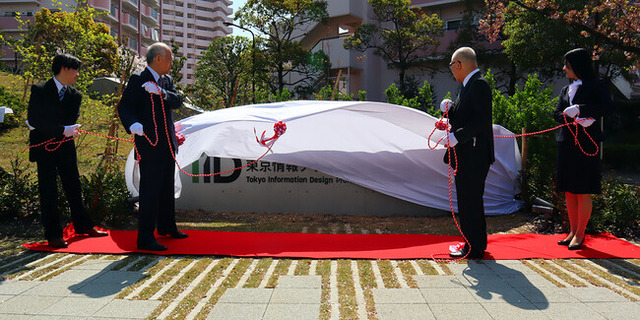 午前10時過ぎから開学セレモニーとして、正門前に設置された大学名を記した御影石製の「石板」の除幕式が行われ、学校法人滋慶学園理の浮舟邦彦理事長と東京情報デザイン専門職大学の中鉢良治学長、それに新入生を代表して学生2名も加わり、計4名が教職員の見守る中、気持ちを一つにして綱を曳きました。「石板」を覆っていた幕が取り外されると、「TID 東京情報デザイン専門職大学」の大学名がくっきりと現れ、拍手とともに参加者全員で開学を祝しました。
