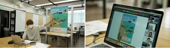 デザインを担当する御茶の水美術専門学校生と20名の小学生は、2人1組のペアとなり、約1ヶ月の間2度のオンライン制作面談を実施。インフォグラフィックのイメージの共有やチェックを行いながら、作品作りを進めます。