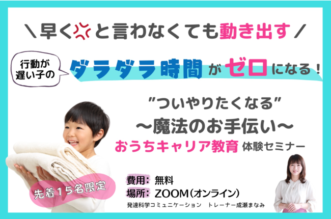 この度は、行動の切り替えが苦手でやるべきことを後回しにしてしまう小学校低学年の発達障害グレーゾーンのお子さんに、脳を育てる「魔法のお手伝い」を通して、自信とやり抜く力を育て、根本から行動力を変えていく、そんなセミナーを開催したします。