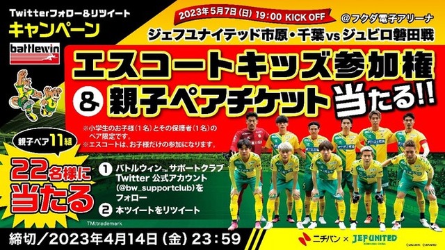 ニチバンのバトルウィン(TM)サポートクラブTwitter公式アカウントをフォローし、キャンペーン対象の投稿をリツイートいただいた方の中から抽選で「エスコートキッズ参加権&観戦ペアチケット」を親子ペア11組22名様にプレゼントします。