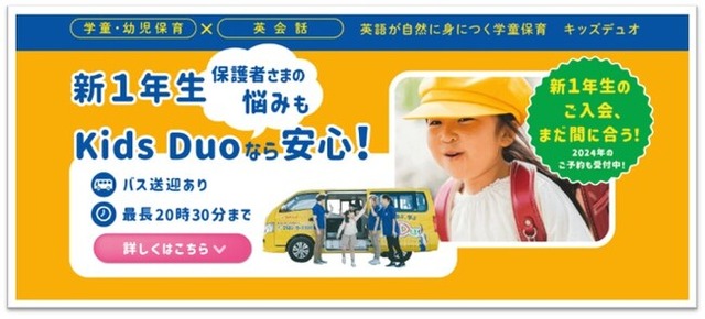 総合教育サービス事業の株式会社やる気スイッチグループ(東京・中央区、代表取締役社長:高橋 直司)が展開する英語で預かる学童保育「Kids Duo(R)(キッズデュオ)」は、今年度小学校に入学した新1年生の保護者さま向けの特別ページを2023年3月31日(金)に新たに公開しました。
