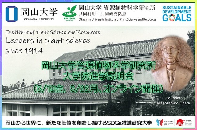 国立大学法人岡山大学(本部:岡山市北区、学長:那須保友)の資源植物科学研究所(倉敷市中央)では、大学院進学を検討されている皆様を対象に、オンライン大学院説明会を5月19日(金)、22日(月)に開催します。