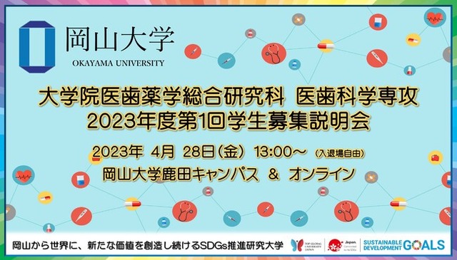 国立大学法人岡山大学(本部:岡山市北区、学長:那須保友)大学院医歯薬学総合研究科・医歯科学専攻(修士課程)では、2023年4月28日(金)13:00から「2023年度第1回学生募集説明会」を本学鹿田キャンパス(岡山市北区)での現地開催とオンライン開催の同時にて実施します。