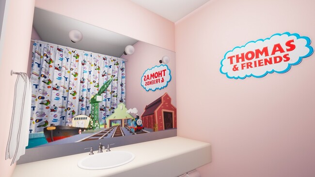 お部屋に入ると、リビングルームの壁一面に描かれたトーマスや仲間たちがお出迎え。ご自身の携帯やカメラでの撮影はもちろん、客室内に設置されたチェキカメラを使用すれば、撮影したお写真をオリジナル絵柄の台紙が付いたアルバムに入れて、ご宿泊の想い出にお持ち帰りいただけます。また、トーマスや仲間たちが描かれたスマートフォン用のオリジナルフォトフレームで写真撮影ができるARサービスもご用意。ご家族皆さまでの記念撮影におすすめです。お部屋の一角には、プラレールトーマスが走るタワーや、車両やレールなどプラレールで思いっきり遊べるプレイエリアも。他にもトーマスの木製レール、ゲーム、絵本、DVDもありますので、ご滞在中、思う存分トーマスと遊んでいただけます。また、バスルームの中にもトーマスと仲間たちが描かれ、シャワーカーテンもトーマス柄に。トーマスの歯ブラシなどのアメニティもご用意しています。トーマスが大好きなお子さまにはたまらない“トーマスづくし”のお部屋で、夢のようなひとときをお過ごしください。