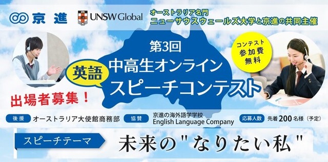 京都・滋賀・愛知を中心に全国で学習塾を展開する京進は、「京進×UNSW Global 第3回中高生オンライン英語スピーチコンテスト」を開催いたします。3回目となる今大会は、QS世界大学ランキング2023で45位のオーストラリア名門大学であるニューサウスウェールズ大学(UNSW Global)と京進が共同で主催し、同じくオーストラリアにある、語学学校業界における世界的な賞「ST Star Awards」で南半球最優秀語学学校の殿堂入りをしている、京進の海外語学学校English Language Companyが協賛します。今回のテーマは「未来の“なりたい私”」。全国の中高生から、テーマに沿った英語スピーチを募集。一次予選の通過者は、8月にオンラインで行われるセミファイナルとグランドファイナルにて、スピーチ発表をしていただきます。応募は先着200名(予定)で、募集人数に達し次第、締切となります。