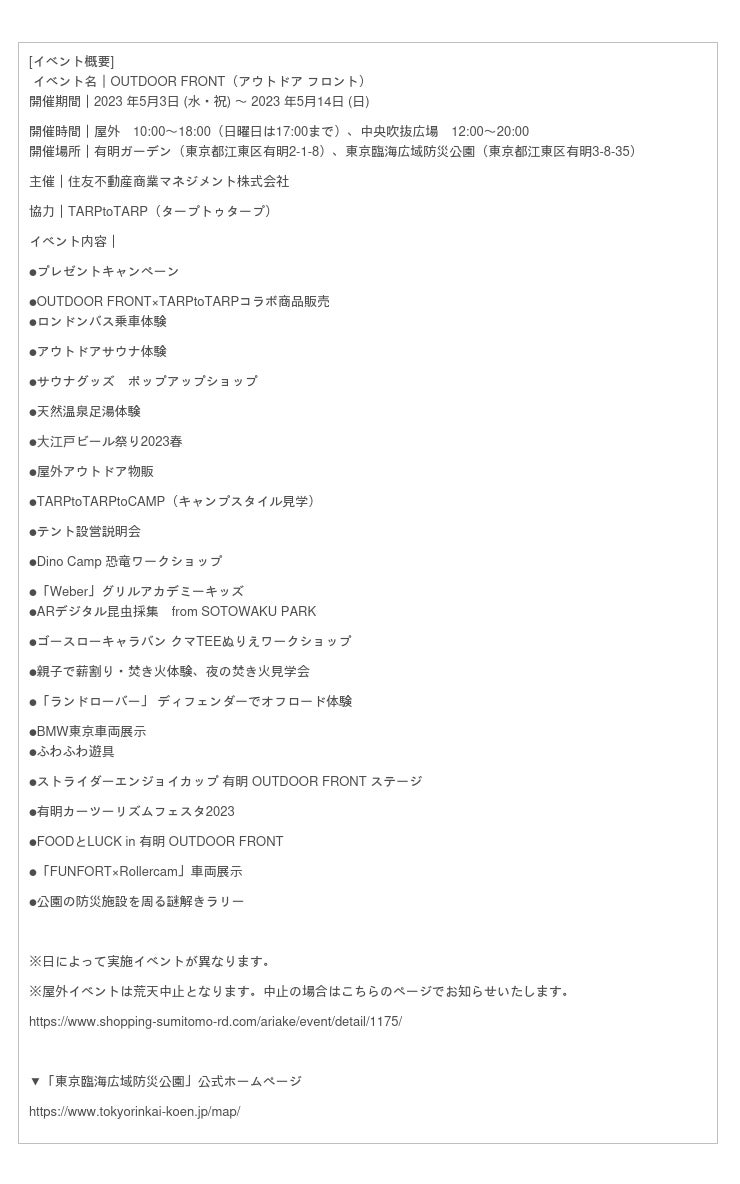 住友不動産商業マネジメント株式会社(本社:東京都新宿区 取締役社長:山本 直人)が、運営する複合商業施設「住友不動産 ショッピングシティ 有明ガーデン」(所在:東京都江東区)において実施するアウトドアイベント『OUTDOOR FRONT(アウトドア フロント)』についてお知らせいたします。
