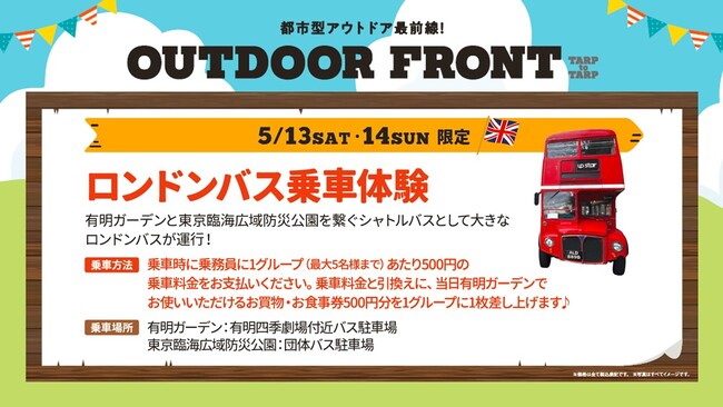 ロンドンバスが、会場となる「有明ガーデン」と「東京臨海広域防災公園」を巡回し、会場間の移動を楽しく、スムーズにします!