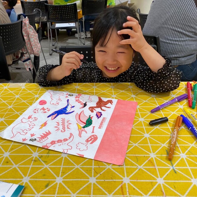 洗濯しても落ちにくい布用ペンでぬりえをしてオリジナルのTシャツが作れるワークショップ。